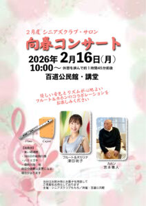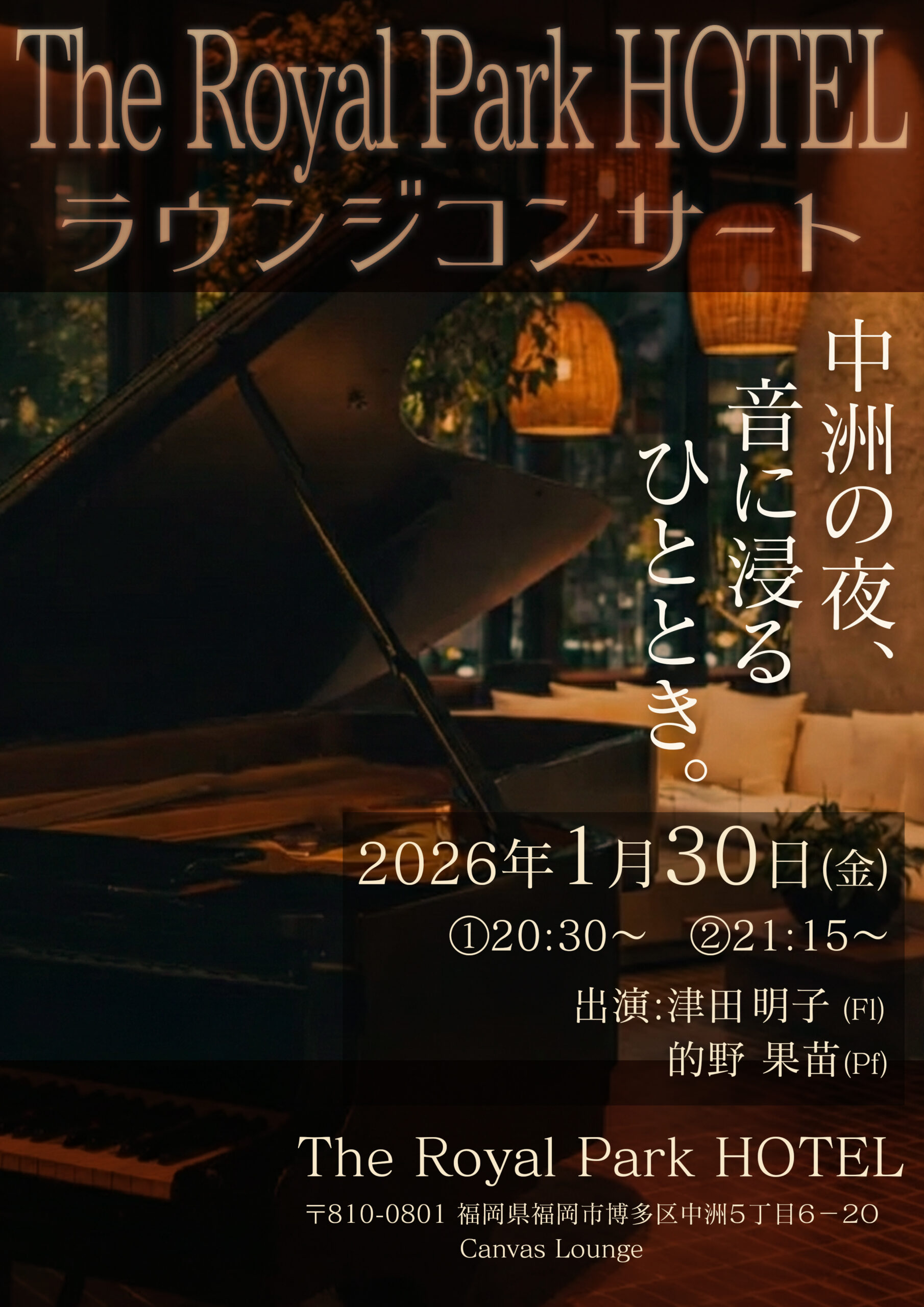 1/30「The Royal Park HOTELラウンジコンサート」 2026 2/12 これまでの出演情報 2026年1月22日2026年2月12日 「The Royal Park HOTELラウンジコンサート」 1/30(金)20:30〜21:15〜The Royal Park HOTEL〒810-0801 福岡県福岡市博多区中洲5丁目6−20Canvas Lounge これまでの出演情報 情報のシェアをよろしくお願いします URLをコピーしました! URLをコピーしました! 1/25「津田ピアノフルート音楽教室 発表会」 2/16「向春コンサート」 関連記事 2/16「向春コンサート」 2026年1月23日 1/25「津田ピアノフルート音楽教室 発表会」 2026年1月21日 12/23「クリスマスディナーコンサート」 2025年11月20日 11/29「百道公民館ももちカフェ フルートとピアノのコンサート」 2025年11月2日 11/26「サイラークリムトコンサート」 2025年9月5日 10/23「フルートとピアノのコンサート」 2025年7月23日 9/21「フルートとピアノの夕日の見えるコンサート」 2025年7月22日 8/15「MUSIC LIVE Weekend」 2025年7月21日