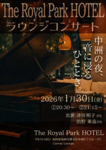 2/16「向春コンサート」 2026 2/26 これまでの出演情報 2026年1月23日2026年2月26日 「向春コンサート」 2/16(月) 10:00~ 百道公民館・講堂 これまでの出演情報 情報のシェアをよろしくお願いします URLをコピーしました! URLをコピーしました! 1/30「The Royal Park HOTELラウンジコンサート」 3/4「サイラーコンサート」 関連記事 1/30「The Royal Park HOTELラウンジコンサート」 2026年1月22日 1/25「津田ピアノフルート音楽教室 発表会」 2026年1月21日 12/23「クリスマスディナーコンサート」 2025年11月20日 11/29「百道公民館ももちカフェ フルートとピアノのコンサート」 2025年11月2日 11/26「サイラークリムトコンサート」 2025年9月5日 10/23「フルートとピアノのコンサート」 2025年7月23日 9/21「フルートとピアノの夕日の見えるコンサート」 2025年7月22日 8/15「MUSIC LIVE Weekend」 2025年7月21日
