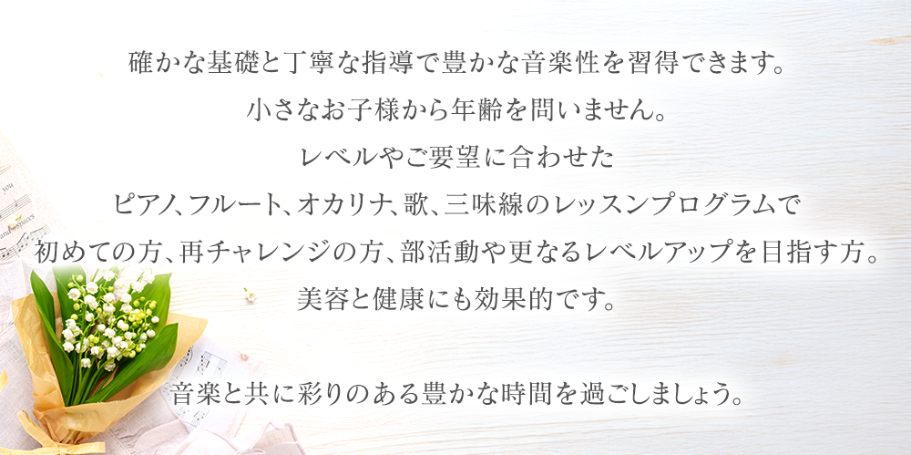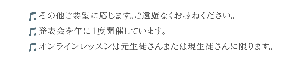※自宅レッスンの場合、無料駐車場がご利用いただけない際は、駐車料金をご負担いただきますようお願いいたします。
